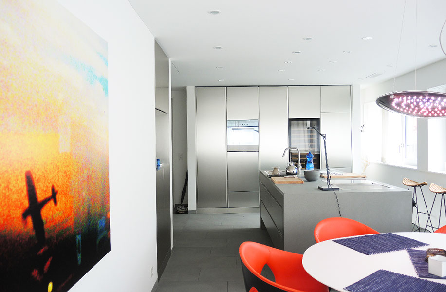 Satiniertes Glas Hightech Edelstahl, entmaterialisierte Räume und Treppenhaus.